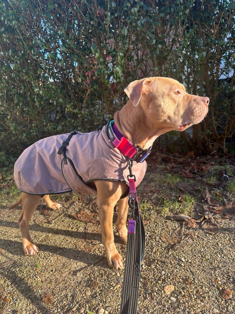 An ihrer Leinenführigkeit muss weiter gearbeitet werden, und draußen ist der Maulkorb aktuell noch sinnvoll und sollte selbstverständlich genutzt werden. Peach lernt jedoch schnell, arbeitet gern mit ihren Menschen und zeigt sich sehr kooperativ, wenn man ihr klare Strukturen bietet. Sie fährt sehr gerne Auto